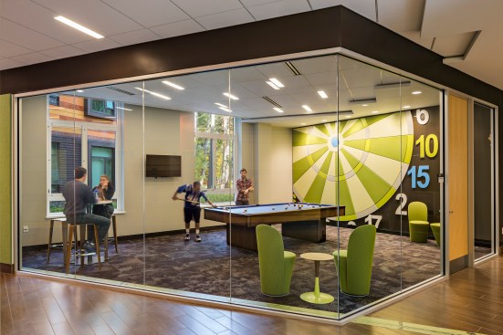 In order to facilitate camaraderie and allow flexibility, ADD Inc used multifunctional, modular furniture that maximized seating options and accommodated different group sizes.