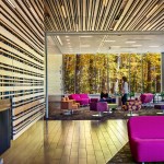 Following this theme, the building’s exterior consists of highly textured red and black brick that resembles bark, while the inside communal courtyard is composed of wood-tone panels. The building’s interior space is similarly inspired through the strategic use of dark colors that gradually grow lighter down the corridors into the “branches” of the building.
