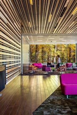 Inside, student rooms and corridors extend like branches out to study perches in the tree canopy. Ground floor common areas and meeting rooms feel like the forest floor with wooded ceilings and colorful furnishings that evoke “wild flowers”.