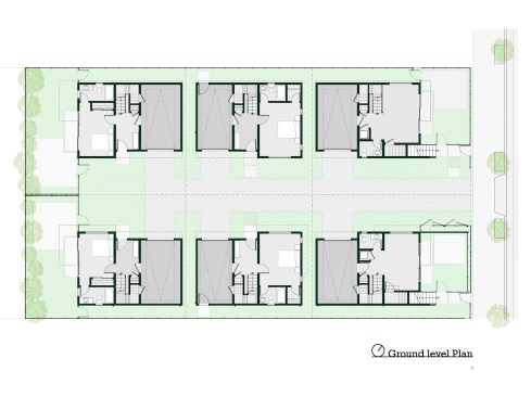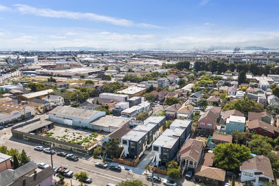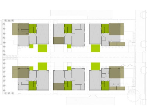 This 6 unit mini-lot subdivision in Oakland, CA. is located on an infill lot in a neighborhood mixed with warehouses and low density residential related to the historic port area of West Oakland. The site is centered in local and regional transit networks.