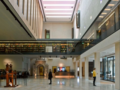 This refurbishment creates immediate impact by re-opening the main lobby to the public with a first floor glazed mezzanine that forms a direct visual relationship with the books. This allows all users to identify with the heritage and with the collections. The visual pockets create booths for study and visual links for the public to admire the building. From the central atrium space a myriad of routes are apparent, including the exhibition space, the cafe and the student study areas. All the connections work, including the access to the archives and the staff areas. The timber panelling has been cleaned to the ceilings, the windows and floors have been refurbished to herald the original features. This building is clearly of national importance and the care that was taken in the consideration of this refurbishment is obvious.