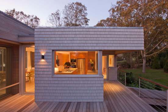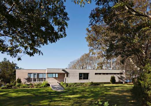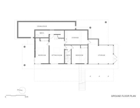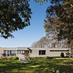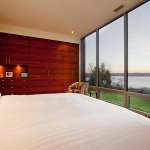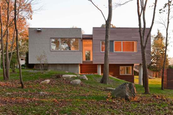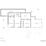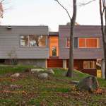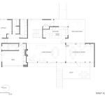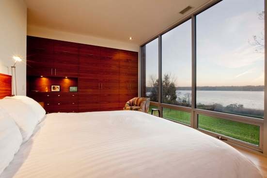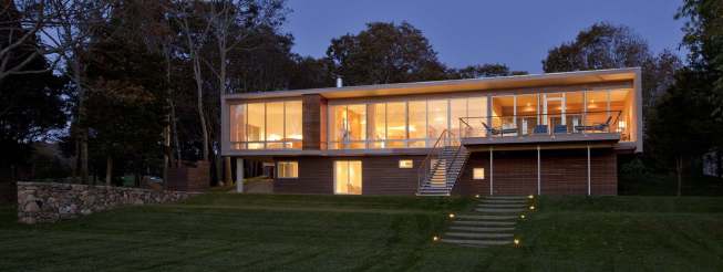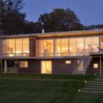 The design consists of two long, low bar-buildings that conceptually float above the site, sliding past each other to enhance views and cross ventilation. The river-side bar has a ten-foot high, eighty-foot long continuous wall of glass facing the river, while the inland bar is lower and largely solid, with selective openings framing carefully edited views of the wooded portions of the property. Both bars are cantilevered off of the existing foundations below, enhancing the floating effect. Between these two forms is a compact circulation zone that terminates at one end in a floor-to-ceiling window facing the woods; the main roof drain is directly above, creating a waterfall that spills into a rectangular bed of river rock in the landscape below.