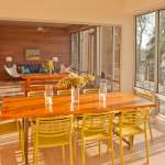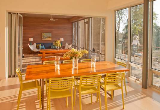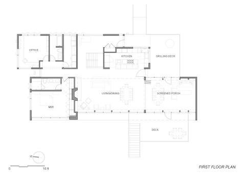 This gregarious couple entertains frequently, so the house was required to be equally comfortable for a house full of friends, children, and grandchildren as it would be for just the two of them. The main level also had to be designed to be fully accessible, so that the house can eventually become their full-time retirement home, and includes an open loft-like living/dining/cooking space, contiguous screened living/dining space, adjacent grilling and lounging decks, home office for his construction business, and master suite. On the ground floor, the owners required two guest bedrooms with shared sitting room and bath, as well as a large storage area for boats and outdoor furniture.