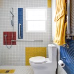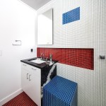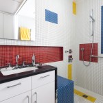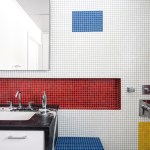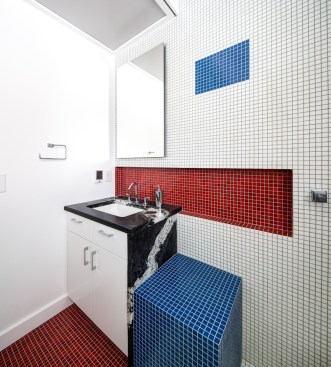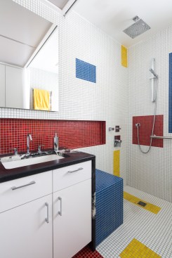 You’re not far from the truth to call this bathroom a work of art. Its design was inspired by client favorite Piet Mondrian, a Dutch abstract artist and member of the De Stijl movement. The basic forms and strong primary colors for which De Stijl gets its instant recognition translated admirably to this 42-square-foot guest bathroom. Brightly colored floor-to-ceiling recycled glass tiles were placed strategically against white surroundings to reinterpret Mondrian’s compositions and to mark off space and functions: Red areas denote recessed niches, for instance, while the blue tiles set off a shower seat and yellow connects shower fixtures with the drain.