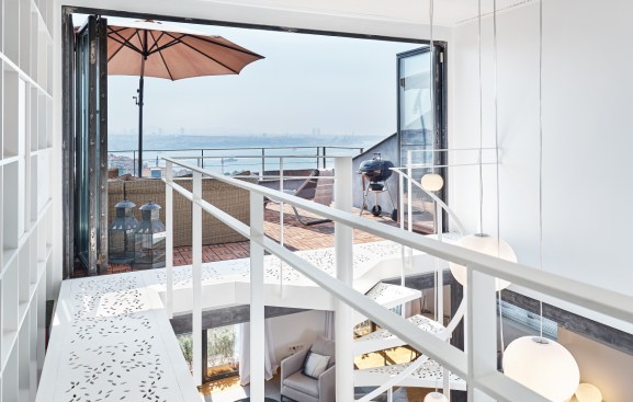 Kate, a British woman working in textiles, fell in love with this view and hoped to create a sweet home full of light. Our main objective was to create a light, open, fresh, bright space with a pleasing cozy touch in this hustle and bustle; with oak parquet and white painted wooden lath ceilings all through the house and iron framed window frames with less obstruction to the view as possible.