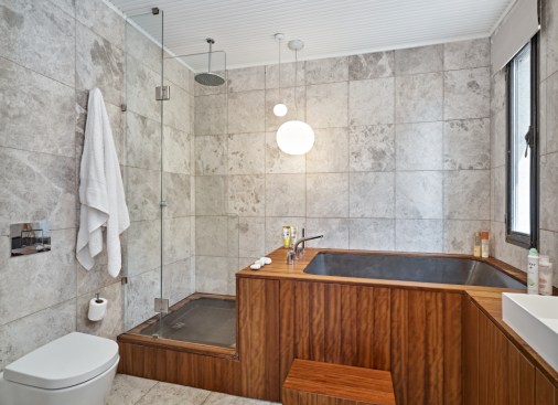 The master bathroom design was expected to be warm, comfortable and useful. Although it is quite small it should encompass a bath and a shower tub at the same time. To accomplish this we constructed all the surfaces of the two tubs with Ytong, isolated for water and then covered them with a smooth cement based material for pleasent touch for naked feet and body. Then we placed iroko laths over iron construction around them creating a continuous and fluent surface and warm feeling, shaping the counter top surface and the necessary cabinets. Wall and floor surfaces are covered with 40x40cm natural marble (the same marble from the living area, but with a different surface treatment and size). The tap fittings for the baths are shared by both the bath and the shower tub.