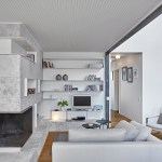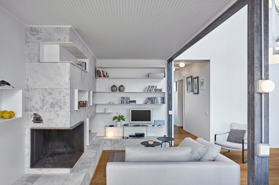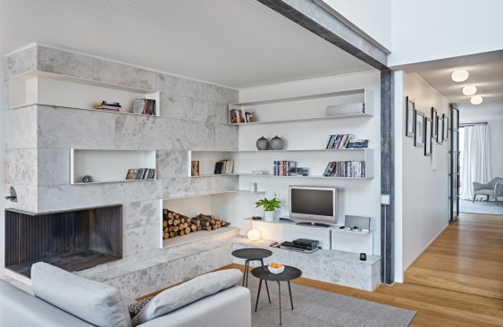 Apart from the spacious, calm seating area with the view of Bosphorus and the old city; a cosier corner for nestling is created with a serene white/grey brushed marble covered wall with white metal skinny shelves, sheltering a cast iron fireplace.