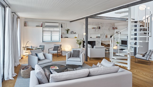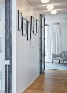Oiled oak parquet is used all through the house (except master bathroom) to create a unity, a flow between spaces and achieve spaciousness. With a parallel approach all the ceilings are covered with white painted wooden laths. Finally the same idea inspired us to make use of, different versions of the Global series of Flos, designed by Achille Castiglioni all around the house as lighting elements.