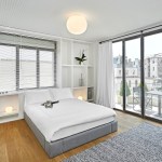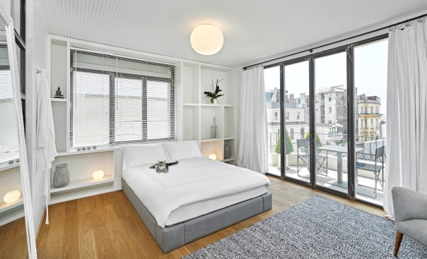 A white and well lit corridor leads to the bedrooms. Serene, sleek and sophisticating ‘all white’ approach continues in the bedrooms as well. Master bedroom’s windows open up to a smaller balcony towards the Istiklal Street. On the opposite side the master bathroom can be accessed through the dressing room with white wardrobes. The dressing room, the bathroom and the bedroom all are separated from each other with sliding iron/glass doors which disappear within the walls when opened.