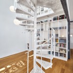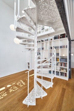 One of the walls of the entrance area fully up to the ceiling is designed as a library/storage encircling the entrance door. A slim metal spiral staircase climbs up reaching the blissful roof top terrace and continues as a catwalk reaching the upper shelves of the library towards the storage. This metal surface is pierced with small leaf forms representing the falling leaves of the cut down trees resulting with the Gezi Park protests in Istanbul which simultaneously took place in time with our construction. These little holes are now creating playful and peaceful sun and shade effects around the house and on the staircase itself.