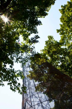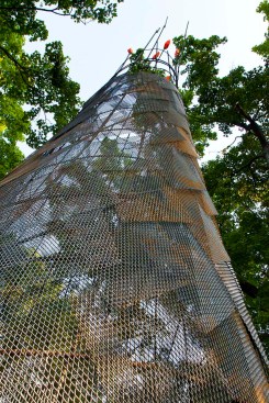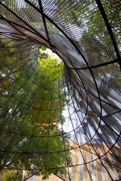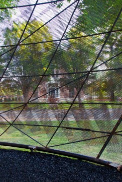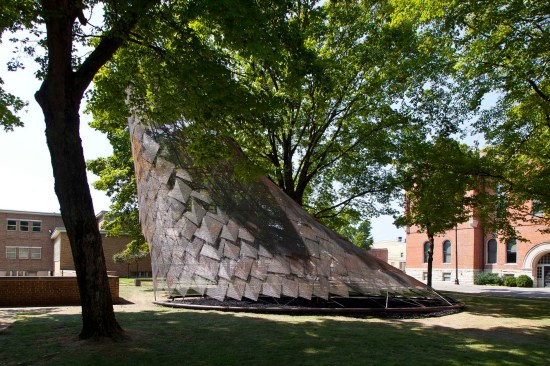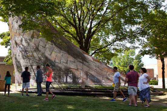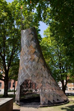 Inspired by the dwellings of the Myaamia people indigenous to Indiana, studio:indigenous adorns a walkway leading to First Christian Church with a contemporary “wigwam” — wiikiaami in the Myaamia language — constructed of rebar and copper scales. The swooping conical form is aligned both to the church’s iconic campanile and to mark the autumnal equinox. The copper scales, equally reminiscent of eagle feathers and textile designs, are perforated and patinated to make shifting patterns of sunlight and shade, creating a space for gathering as well as a gateway to Saarinen’s church.