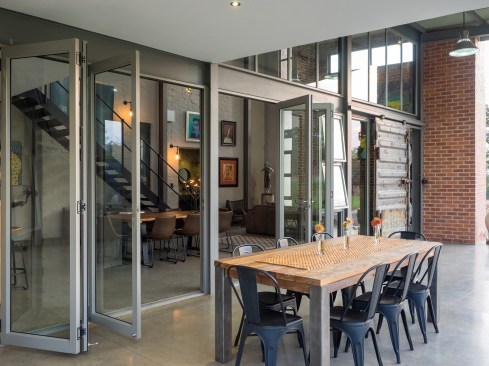 Wilde Sering explores the South African tradition of living life on the front ‘stoep’ offering a bushveld hideaway that figuratively grows out of its surroundings by imitating the free flowing branches of the numerous Wilde Sering (Burkea Africana), Boekenhout (Cape Beech) Lekkerbreek (Ochna Pulchra) surrounding the home. A walk through the house feels like a walk on a bushveld path, with each room becoming a place to stop and appreciate nature. The front ‘stoep’ & living areas runs the length of the house, with rooms spilling off it. Some external cladding elements are allowed to weather and rust, imitating the natural hues and colours of the bushveld. A rusted steel door constructed from an old railway carriage slides open to reveal the main living area. This home purposely confuses the traditional boundaries between a home and its surroundings.