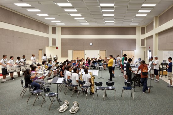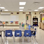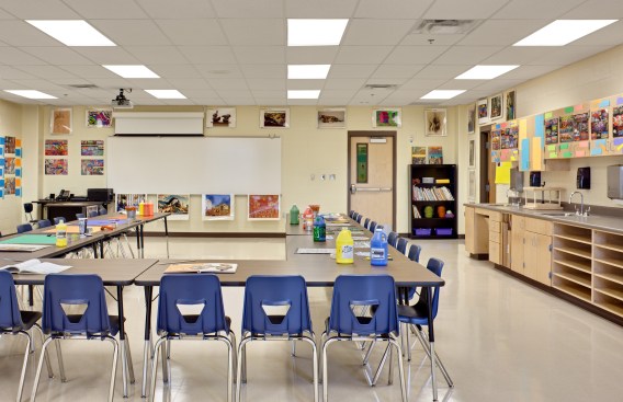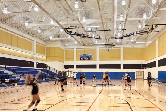 The primary organizing element of the building’s plan is the two-level east/west circulation corridor that links all of the major program areas: administration, fine arts, theater, gyms, locker rooms, cafeteria, and classroom wings. “Public” areas including the theatre, gyms, and administration are concentrated at the front of the school.