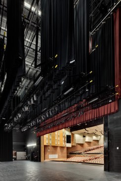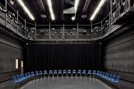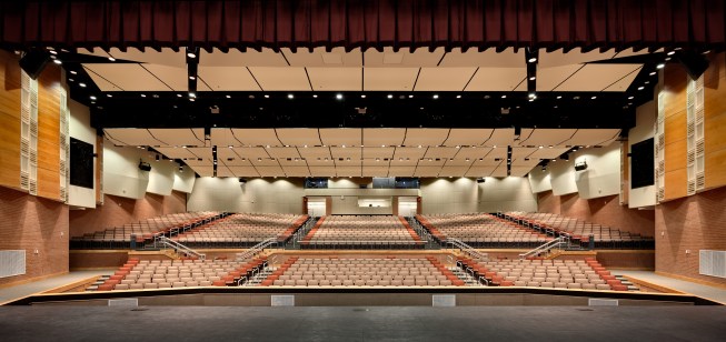 With 1,200 seats, the Brennan HS Theatre is a flagship feature of the school campus and the community. It is the first in the area to have a fly loft, which will allow NISD students to do massive scene changes. The theater has 30-40 rigging line sets, a 1,300 SF orchestra pit, a separate black box theater, a costume shop and incorporates many state-of-the-art theater technology elements. The orchestra pit underneath the stage is an electronically powered lift floor which can be raised and lowered during the performance.