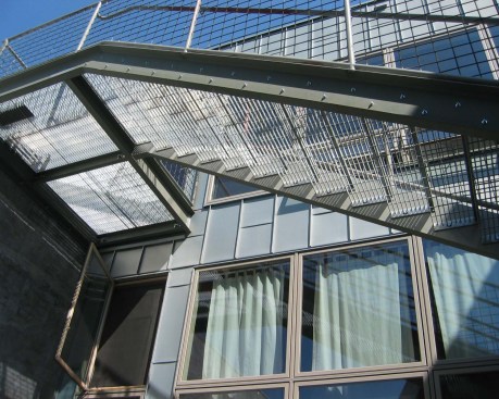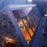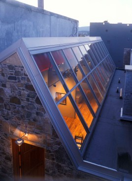 The buildings are structured to bear substantially on their interior steel frames owing to the question of the structural integrity or the future use of the adjoining buildings. The studio and residence are framed in exposed timber. The gallery and visiting artists residence are simple spaces in painted drywall. Color informs each space. The exterior is clad in zinc and local stones. The windows are fiberglass clad wood out of the catalogue.