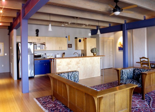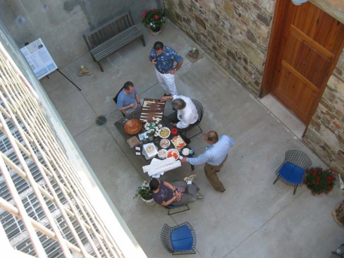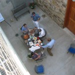 The painting studio was the project’s first phase. One of the artists works on very large canvasses; consequently the studio is a tall, broad space with ten foot tall doors. The program brief suggested modern structures arranged around a courtyard. The end result is richly informed by the skills and experiences of the participants; one of the artists laid all the stonework, and the craftsman who built the project.