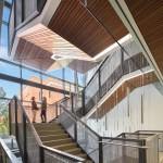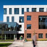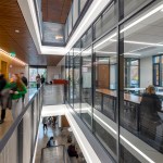 With a sense of openness, transparency and natural light, the architecture strengthens internal and external connectivity to feature views and visual site lines. A large light well and open stair heighten this experience, and the stair’s central location embraces pedestrian circulation and tactile collaboration with an interactive sound sculpture. The building is conceptually organized into three interlocking forms with material related to program and spatial character: custom brick for state-of-the-art classrooms, performative terra cotta wrapping innovative program features, and high-performance glazing for the central stair and Commons, a communal venue flowing onto a new outdoor plaza.