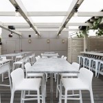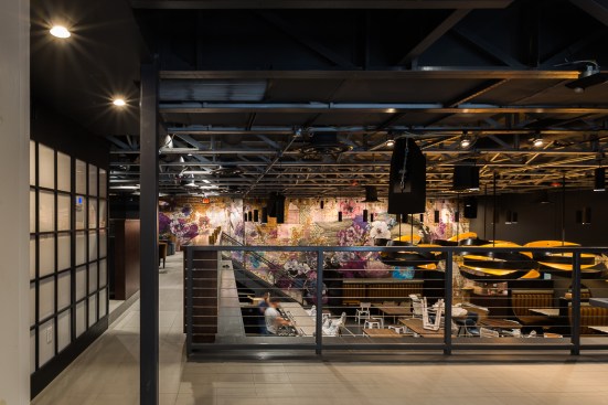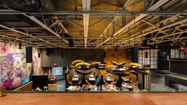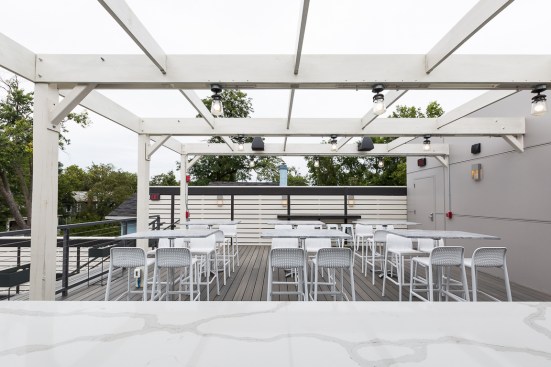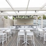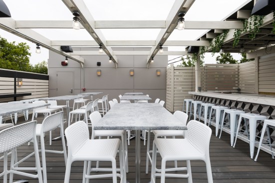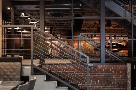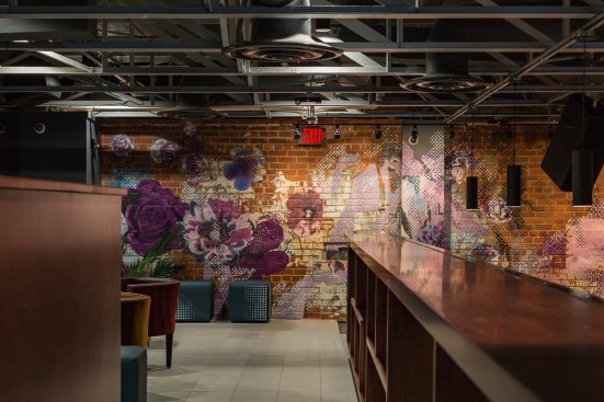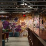 This new concept required a gut job and a complete interior renovation, including the addition of the roof deck with bar and pergola, structural wall openings between the two distinct parts of the building, additional accessible bathrooms, patio seating with steel pergola, sound control wall, new kitchen and bar equipment, new lighting, and complete interior design with art installation by Swatchroom.