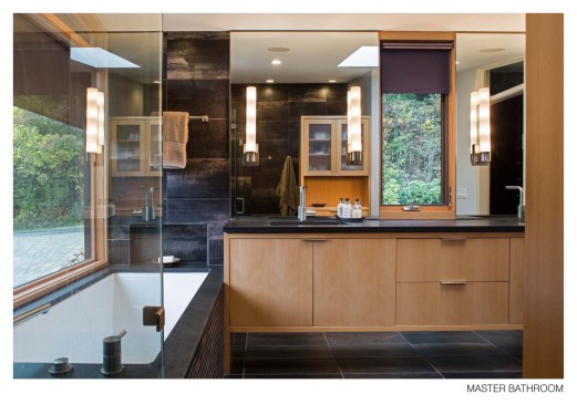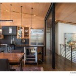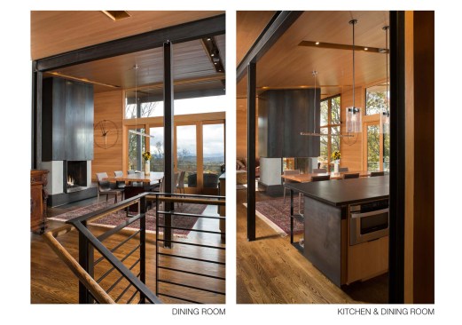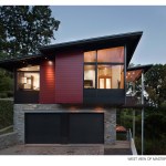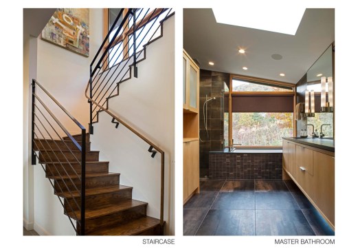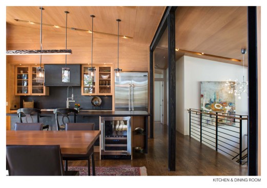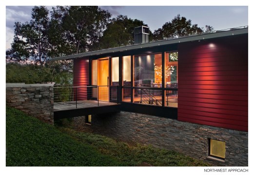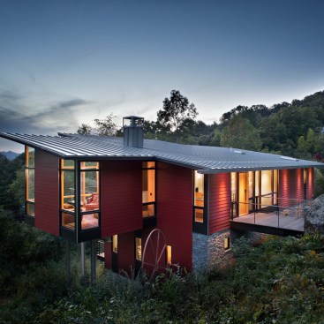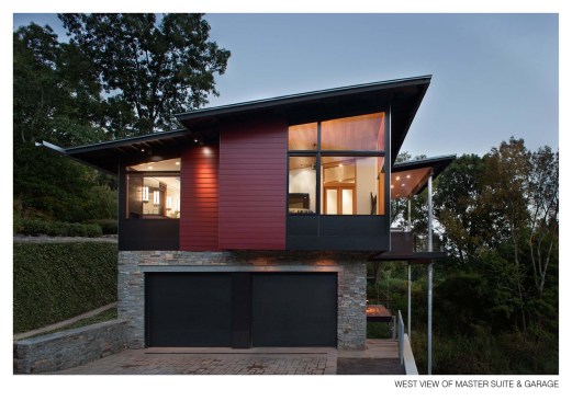 The house is located on a steep site in a developed North Asheville neighborhood. The single sloped roof contrasts with the site topography, forming a modest entry that opens up to expansive views at the rear of the home. The living, dining, and outdoor areas are placed to capture these views of the surrounding Blue Ridge Mountains. The Interior is wrapped in warm cypress and European beach and is accented with darkened steel elements. Energy modeling during the design phase, along with LoE windows, foam insulation, and a geothermal heat pump create a very efficient home.