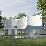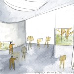 The site’s remarkable surrounding trees provided a central idea for the composition of the building, which Steven Holl calls a “pavilion on the park.” Raised kite-like into the trees, the building’s light profile is a concave response to the large diameters of the campus’ trees—many over one-hundred years old and the oldest things on F&M’s historic 19th century campus. A prominent feature of the design is a glass-enclosed forum in the center of the ground floor that will allow pedestrians on the campus side of the building to see through to the green landscape of Buchanan Park. The new building will form part of a new Visual Arts Quad with a storm water reflecting pool at the south end of the campus marking a new college entry centered around the arts.