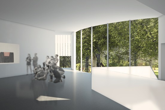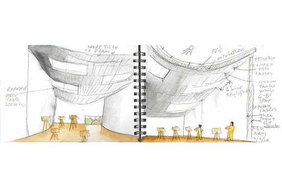 The billowing suspended lightweight architecture of the new building is articulated with thin in wall trusses – like a box kite. The concrete walls at the ground level articulate the light & heavy distinction like the heavy trunks of the nearby trees.