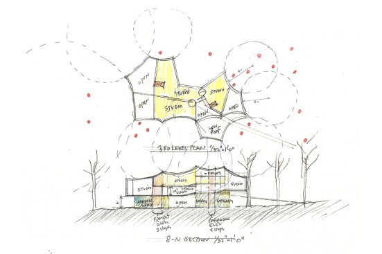 The billowing suspended lightweight architecture of the new building is articulated with thin in wall trusses – like a box kite. The concrete walls at the ground level articulate the light and heavy distinction like the heavy trunks of the nearby trees. The skin is made of a new recycled glass aggregate material called “Poraver” with natural light to all studios provided by Okalux insulated channel glass and skylights. There are operable glass windows in every studio.
