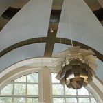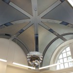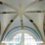 The only way to achieve a smooth effect and create the curved vaulted shape was to face-mount segmented panels to a ribbed, t-bar suspension system custom-made by Chicago Metallic, according to Acousti Engineering. The seamlessness of the ceiling creates the illusion that it is either flat or curved, depending on the viewer’s perspective.
