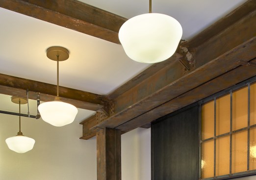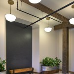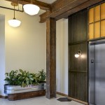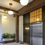 Douglas Development began transforming the historic Wonder Bread factory building in 2012 into unique loft-style offices with high ceilings and large glass windows. Wingate Hughes Architects, the designers for the 1,000 SF Wonder Bread building lobby, introduce guests to the refurbished office building by blending the old with the new within the building entrance. The lobby design utilizes industrial steal beams and exposed pipes to frame the elevators and ceiling. They balance the factory vibe with a rich, rustic sophistication by using mosaic tile flooring and a tile wall inset behind a raw wood and iron bench for seating. Elegant brass lighting fixtures run along the ceiling adjacent to distressed steal beams, offering additional lighting for night. During the day, the floor to ceiling windows and glass block side wall provide the space with ample natural light. The lobby’s composure heightens with deep wood paneling and amber stained glass window panes bordering the elevator doors.