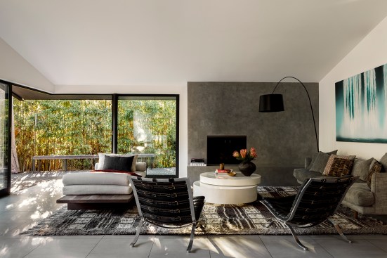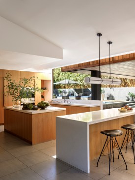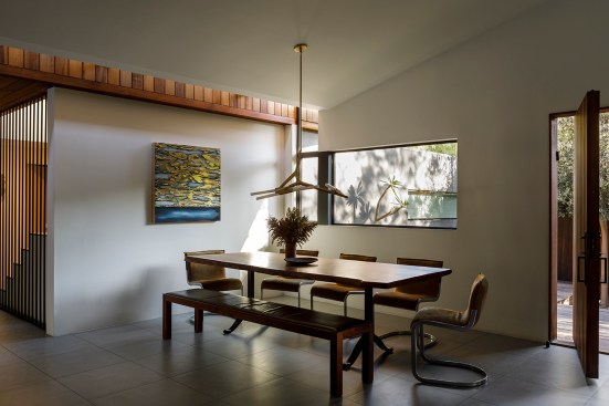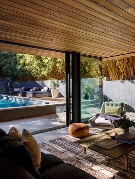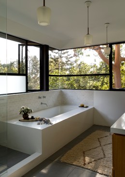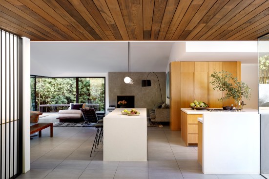The kitchen is the heart of the residence, physically connecting the social and private areas and providing views horizontally to the landscape and vertically through the skylight. Floor-to-ceiling glass sliding doors are positioned on opposite corners of the plan so that a diagonal axis is established from the front yard that passes through the interior spaces and out to the back yard and pool. Comparable transparency continues upstairs where the primary bedroom and bathroom enjoy vistas into the forested surroundings of the Los Angeles canyon.