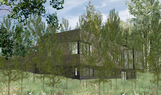 The sloping site is located at the edge of a meadow and forest, with a small stream running nearby. The aspen forest and stream course have a fragile, ethereal quality.