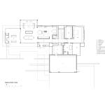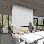 The plan of the house is a singular bar forming a boundary, in the forest to the North and on the Meadow to the South. The bar is abstracted – interior space removed – for an outdoor living room adjacent to the creek. The only protrusions are a glass living room that lives in the trees and garage.