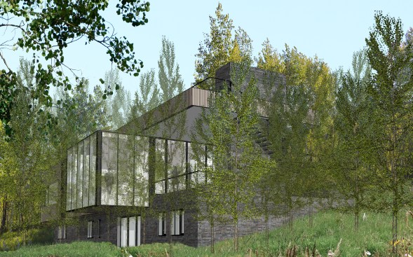 In section the house utilizes the sloping topography: main living spaces engage the meadow at grade but cantilever over the lower level, projecting into the forest as a tree house. The roof is used as a terrace. The living and garage protrusions have lower roofs and are subservient to the primary bar.
