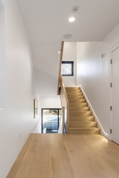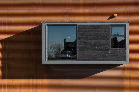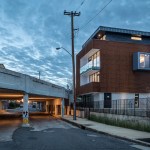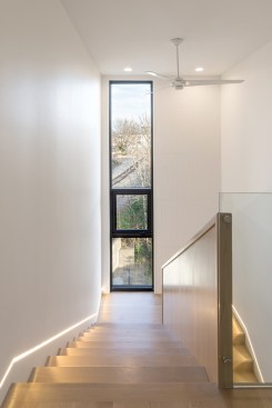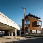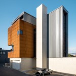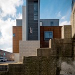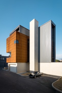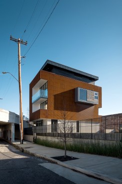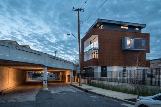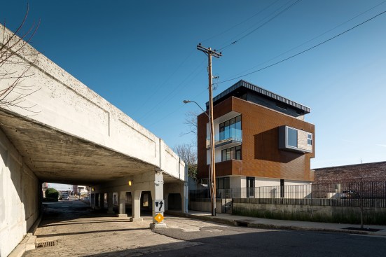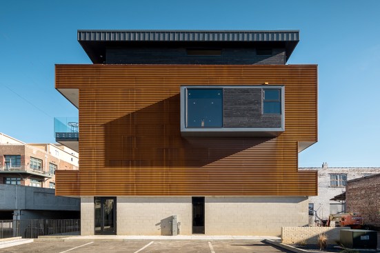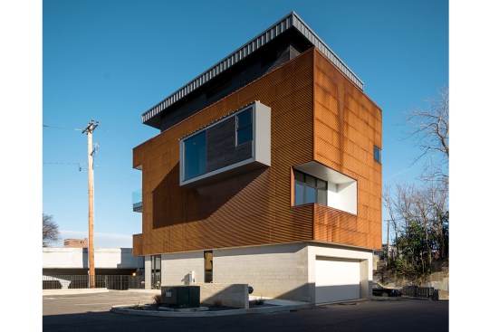 This urban residence is situated within a mixed-use development between the South Main Historic Arts District and the Mississippi River bluff. The small lot was carved from a recently completed development including a re-purposed warehouse into offices and four attached townhomes. The 3,750 sf home consists of four levels – a ground floor garage/office, a second floor suite for the client’s mother and her caregiver, living and kitchen on the third, and a master suite on the fourth floor. The compact site exists between a railroad overpass to the North and an alley to the East, allowing shared vehicular access to the home. The overall massing is broken down using durable and low maintenance materials. A corten clad rectangular form rests atop a ground-face masonry base. The corten volume is further articulated with a series of large scale carves that form balconies and window openings that frame views. Planar elements clad in charcoal standing seam metal encase the circulation wing and fourth floor master suite and employ glass and charred wood infill. A large projection on the West is an external expression of the intersection between the main mass and circulation wing. Positioning the circulation wing perpendicular to the main volume maximizes the interior space, takes advantage of the triangular shaped lot and provides lateral stability for the four-story structure. This articulation of the mass mediates the various scales and materiality of the surrounding industrial context and allows the interior programmatic elements to be a clear expression on the exterior.