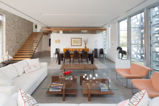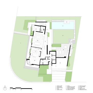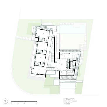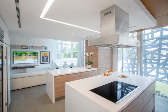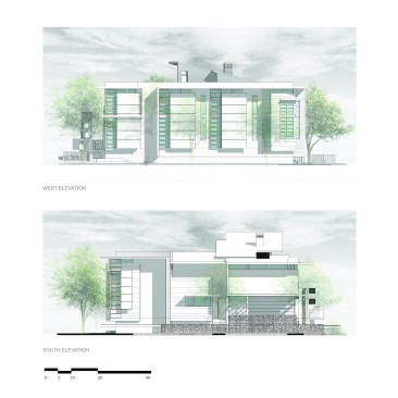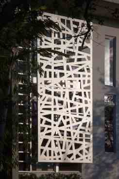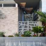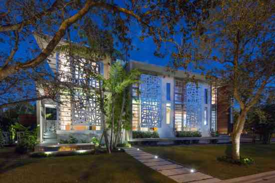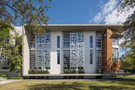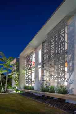 The program called for a home for a family of five in a corner infill lot in a South Florida Island residential community. The site is flanked by single family homes and is located across the street from the neighborhood school. The design challenge involved the development of an extensive program of indoor and outdoor spaces in a restrictive site. In addition, the living spaces had to be set at a flood elevation six feet above the existing grade. Some of the goals set forth in the initial stages of design included: Minimizing the building footprint and creating a private outdoor courtyard, that would be integrated with the indoor spaces despite the change in elevation. Orienting the main living spaces towards this private courtyard and/or towards the more residential street to the West of the site. Separating the pedestrian and the vehicular/service entries to the home, with the first located along the private residential street and the second on the more public street across from the school. Decorative metal screens serve to modulate the western sun as well as provide privacy from the street.
