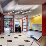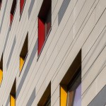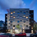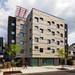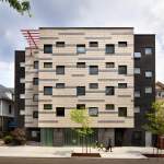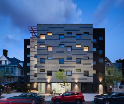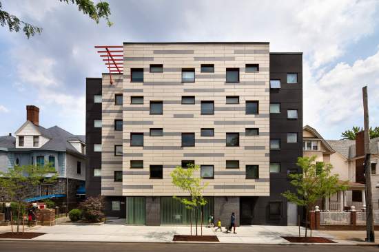 Woodycrest Veterans' Housing is a 6-story with cellar affordable/supportive housing residence located on Woodycrest Avenue between East 163rd and East 164th Street in Bronx, NY. Co-developed by the CMC Development Group and HELP USA, with funding from NYC HPD, the building houses 48 studio units and amenities that include a community room, laundry room, exercise room, outdoor recreational area and program offices to provide support services. The masonry and pre-cast concrete plank building structure is clad with a glass fiber-reinforced concrete (GFRC) panel rain screen system and an exterior insulated finish system (EIFS). The window returns add a touch of colorful brightness to the neutral grays of the building street facade. At the ground floor community room, a channel glass storefront is used to provide light and transparency. The building complies with the Enterprise Green Communities criteria and the NYSERDA Multifamily Performance Program.