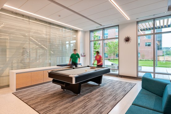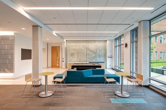 The lobby includes a multipurpose room for 30 that can be used for gatherings. A social area on the ground floor features a pool table and counter space for student interaction, and the interior courtyard provides valuable green space.