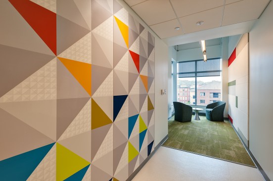 The interior color scheme reflects the exterior by incorporating blues, greens and teals in custom designed carpets and wall coverings that draw from the metal panels, while oranges suggest the building’s outdoor brick color.