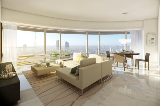 World One’s unique cloverleaf plan is a decisive response to the singular challenge of creating an iconic supertall residential tower on a dense site. The apartments—six “world residences” per floor in the first tier, two “world villas” per floor in the second tier, and duplex “world mansions” at the top of the tower—are naturally cross-ventilated, with high-performance low-E glazing and automated lighting controls.