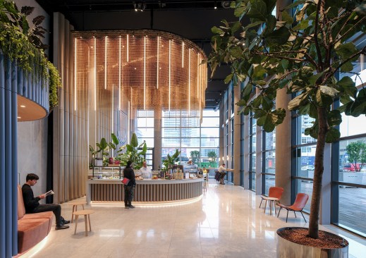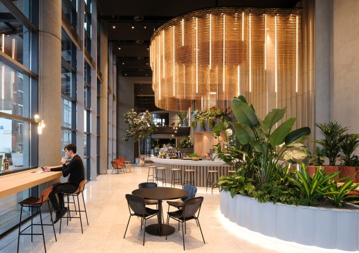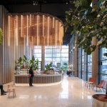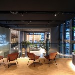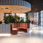 Mecanoo’s user perspective method creates a concept to use the lobby as the start of the working environment by facilitating various activities. All activities enable a grand entrance and an interesting and comfortable place to stay. The concept enfolds, based on the semi-circle form of Foster’s building, with various rooms where diverse activities, both formal and informal, could be facilitated. Rooms to meet, rooms to drink, rooms to relax, rooms to wait, rooms to work, rooms to have an event. The Rooms both facilitate the formal functions, such as security, the welcome desk and lockers, as well as more informal amenities like a meeting space, lounge areas and the main bar for bigger events.