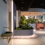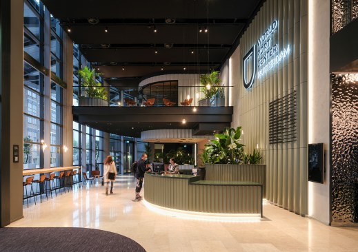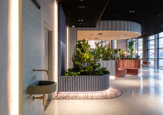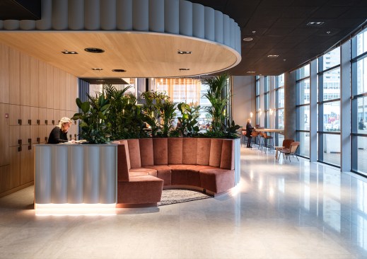 The design uses the space along the facade for seating and locates all facilities along the building core with improved sightlines and inside-outside connections. Design elements with a strong identity, such as the Rotterdam Port Authority backlit logo and the airy curtain above the bar are visible from the exterior. These iconic elements add value and create a sense of place for the employees and visitors. New programmes including check-in booths, a coffee bar, and areas for informal meetings activate the double-height entrance hall. A new spiral staircase connects the lobby and first floor and offers scenic views of the water.