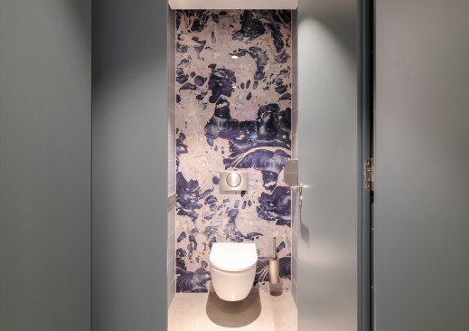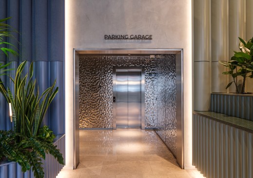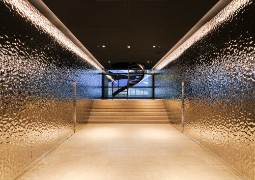 Using the semi-circle shape at different scales and in various ways, Mecanoo created a cohesive interior design. Durable materials were chosen to match the character of the area. Metal, wood, leather, concrete and upholstery, with sound-absorbing surfaces create a tactile and textured backdrop for the various rooms. The location of the different materials are determined by how the different rooms will be used, both from an acoustic and durability perspective. The lifts lobby was upgraded with cladding that emphasizes the cut in the building core. Water ripple hammered metal panels hint to the harbour, and the new dark ceiling matches the entrance area.