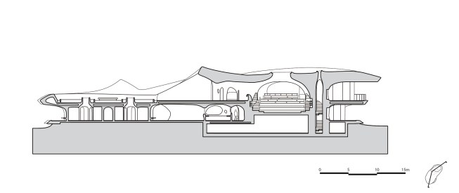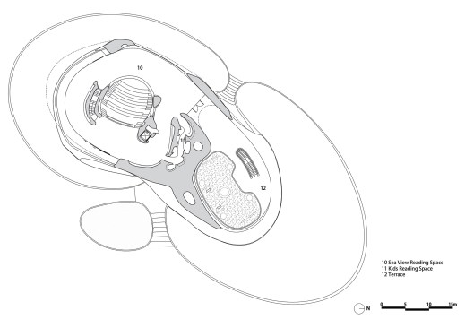The interior is composed of two parts: a 690-square-meter (7,430-square-foot) reading space that can store approximately 10,000 books, a café and a terrace; and a 300-square-meter (3,230-square-foot) public rest area that is equipped with a bicycle parking system, public bathrooms, and shower areas.
