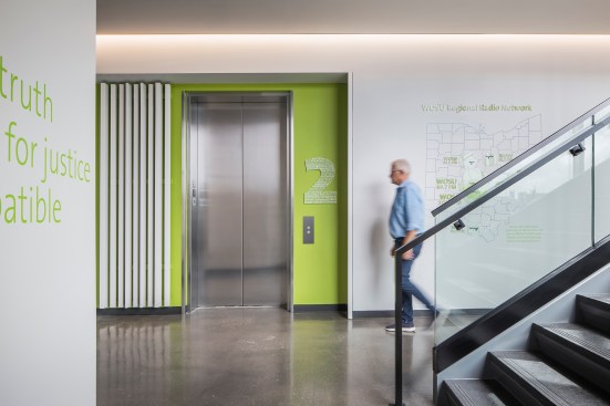 Below grade offers the most considerable ceiling heights and is home to two TV studios, video and audio control rooms, master control, and edit suites. Talk radio, performance and production studios, and the newsroom find their home on the second floor. The third and fourth floors offer edit suites, workspaces, meeting areas, podcast recording areas, and a media learning lab accessible to community members.