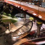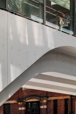 Earthen materials including concrete and stone ground the project, while lighter elements such as glass and metal provide diaphanous canopies filtering natural and artificial light. The form of Wynyard Walk harnesses human desire to create the most efficient route, imbuing the project with a unique character and identity.