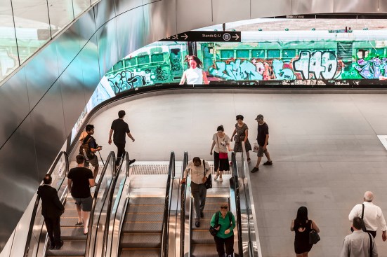 Designed as a piece of socially sustainable infrastructure, Wynyard Walk enhances the experience of (projected) 20,000 commuters per hour via a timeless architectural form complemented with integrated digital art. Residing within the Clarence Street entrance of Wynyard Station, the 23 metre wide Wynscreen – named as a play on the word ‘windscreen’ due to its unusual curved shape – combines art, culture and technology to create a series of visual experiences.