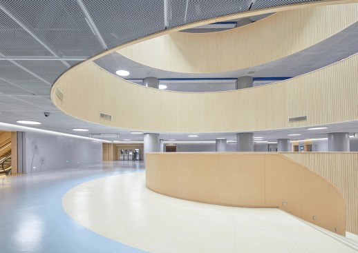 The soft curved building provides an independent maternity, gynecology, and inpatient garden, including a sunken garden for the outdoors of the hospital. The well-arranged curves of the building bring a closer feeling to the main atrium which is in the inner space of each floor. From the entrance, the obstetrics and gynecologists have their own circulation paths and do not interfere with each other. In the other hand, the research and laboratory area are also connected to the clinics and wards, facilitating the collaboration between different professionals.