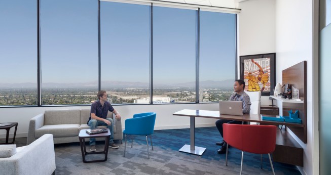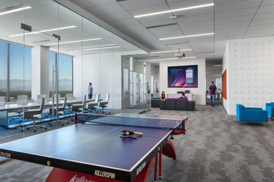 Immediately upon entering the elevator lobby, Xsolla’s bright, white space announces them as a vibrant, playful force. The bright and open reception area highlights a large conference room through 12-foot high glass, taking advantage of the 22nd floor views of the valley beyond. Existing perimeter offices were maintained and paired with open work areas, social spaces, and a “Battlezone” where gamers can test new products.