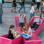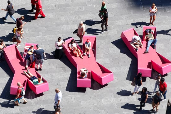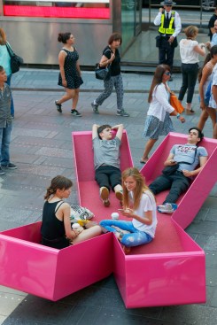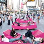 Times Square Arts and J. Mayer H. inaugurated XXX TIMES SQUARE WITH LOVE, three X-shaped outdoor loungers custom designed for Times Square, each of which can accommodate up to four people who can literally lie back, stare up and send a snapshot of either themselves of the mix of signs and sky above them.