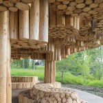 Located in a slightly sunken landform between the main facilities of the Art Center and the beginning of the hiking tracks, the pavilion rises in a clearing surrounded by aspen trees, facing a small creek. Entirely carved in wooden logs, the pavilion symbolically invites the visitor, who in the Tippet Rise Art Center is confronted with nature at its widest scale, to access the most secret part of nature, the heart of the trees. The sustainable pine wood used for the entire pavilion, locally sourced from a natural pruning process that saves forests from parasitic bugs, is employed in its raw appearance.