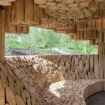 In the pavilion, sunbeams penetrate between the vertical logs, creating a play of light and shadow that softly hits the underlying organically shaped seating and the polished concrete circular platform. The spatial complexity of the carved wooden seating elements emphasizes the stunning views of the surrounding landscape through strategic positions and encourages different appropriations by the visitor, who is invited to inhabit them at his wish. Through exploration, the user can, in fact, discover the different spatial configurations of the pavilion, gather in small groups or have a chat between friends, lie and watch the romantic views with his partner, or sit and meditate in solitude on his visit of the Art Center.